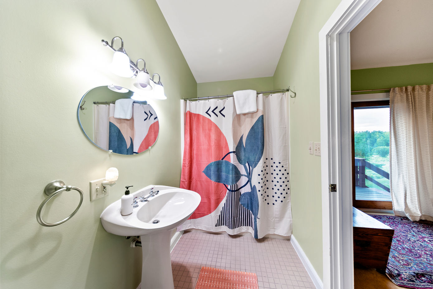 The Weaver Suite offers a king bed, hardwood floors, bold décor, and a private deck with Adirondack chairs. The ensuite bath includes dual sinks, a stand-up shower, bidet, and a jacuzzi tub—an ideal place to relax after a day of hiking, biking, or simply enjoying the peaceful natural setting.